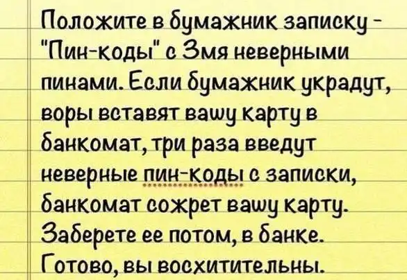 На редкость удачный пост, многое улыбнуло !!! Отдельное спасибо, за ПИН- коды! Напишу и вложу жене в кошелек !