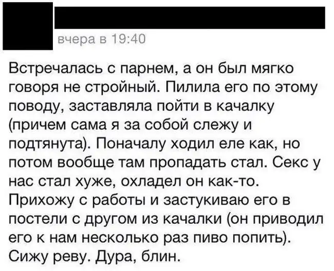 3ю снизу какой-то жиробас написал, чтоб его подруга не пилила?