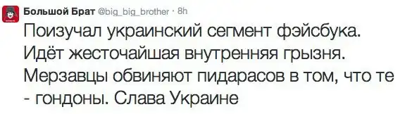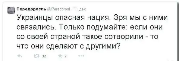 может хватит? я устал видеть псевдоненависть.етот выброс говна в вентилятор просто противен. я украинец живущий в израиле с 2002го года я просто увидел етот сайт пару лет назад и мне даже в голву не приходило подумать плохо или подумать что ето типа другая страна или здесь будут плохо относиться к моей национальности.я в жизни не представлял Россию как врага. просто придите в себя. спасибо