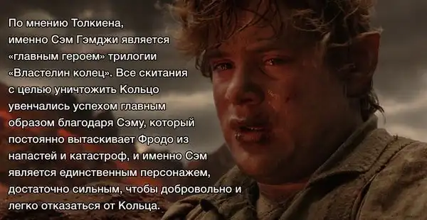 Всегда считала Сэма настоящим героем, т.к. он пошёл туда только из-за Фродо, хотя и очень боялся и не хотел оставлять свою невесту. Тащил Фродо на себе, когда тот начал тонуть в своей депрессии, выдержал всё и не ждал признания, не свернул с пути и был с Фродо до конца. А кольцо сломило Фродо довольно быстро...