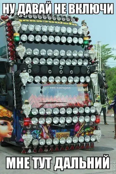 1. В чём прикол фразы на картинке (где фура с десятками фар): "НУ ДАВАЙ НЕ ВКЛЮЧИ МНЕ ТУТ ДАЛЬНИЙ" ?