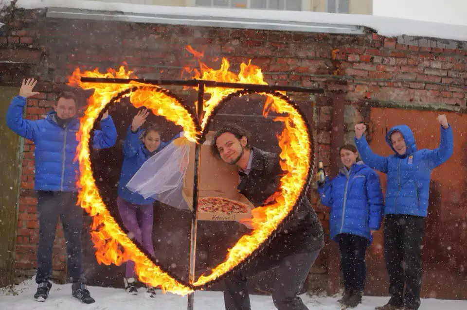 Отслушав вальс Мендельсона и получив свидетельство о браке, новоиспеченные "супруги" отправились на романтическую прогулку в сопровождении фотографа. Вернувшись к офису доставки, "молодые" с удивлением обнаружили, что на улице их ожидало настоящее огненное шоу для влюбленных.