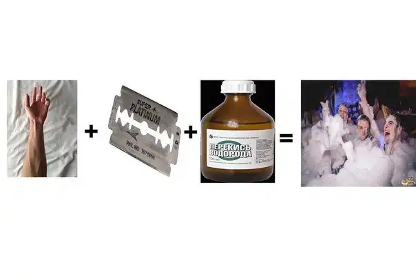 Режешь вену, кровь выливается в ванну для пенной вечеринки. В кровь льешь перекись, появляется пена - зовешь друзей (если остались силы).