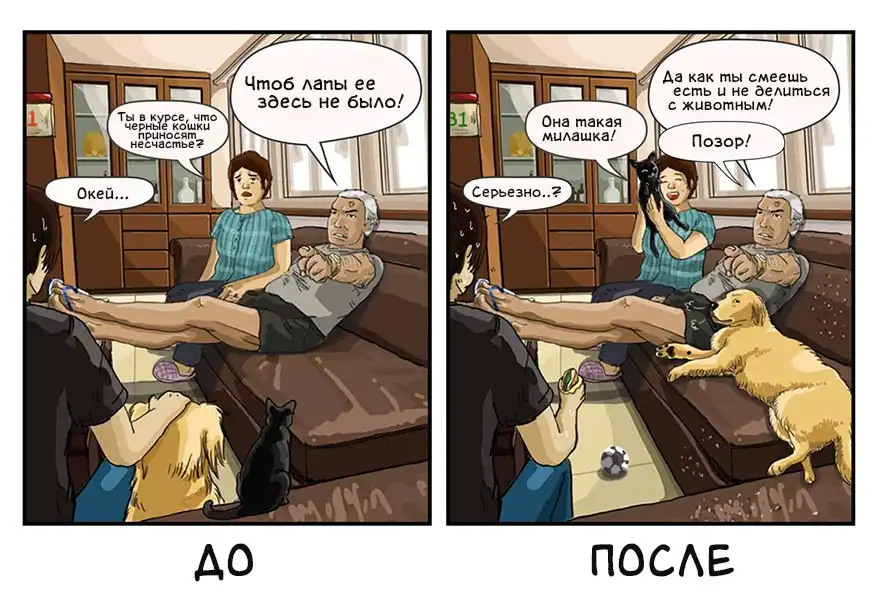 Итак, вы решили завести собаку. Владельцу золотистого ретривера Джону есть, что вам сказать. В своих очаровательных иллюстрациях он продемонстрировал, как изменилась его жизнь, когда он завел щенка по прозвищу Меймай, также известного как "милейшее и пушистое маленькое зло". Можете уже начинать чувствовать себя виноватым за то, что не делитесь едой с новым другом. Забудьте о чистоте в квартире.