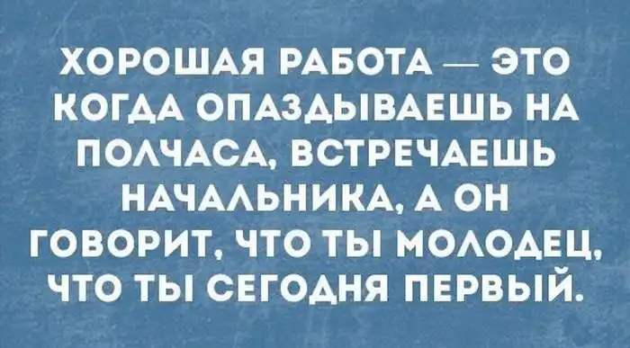 Хорошая работа, это когда тебе директор звонит и спрашивает когда ты на работе появишся, а ты сидишь дома за компом в трусах и думаешь когда же тебе там появиться.