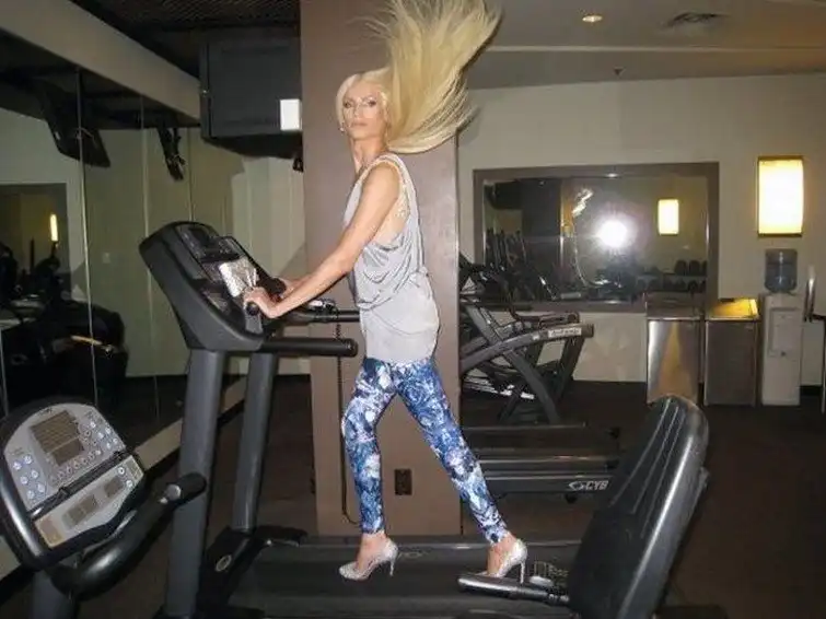 Как же без каблуков в тренажёрном зале? Истинная леди не может себе такого позволить.