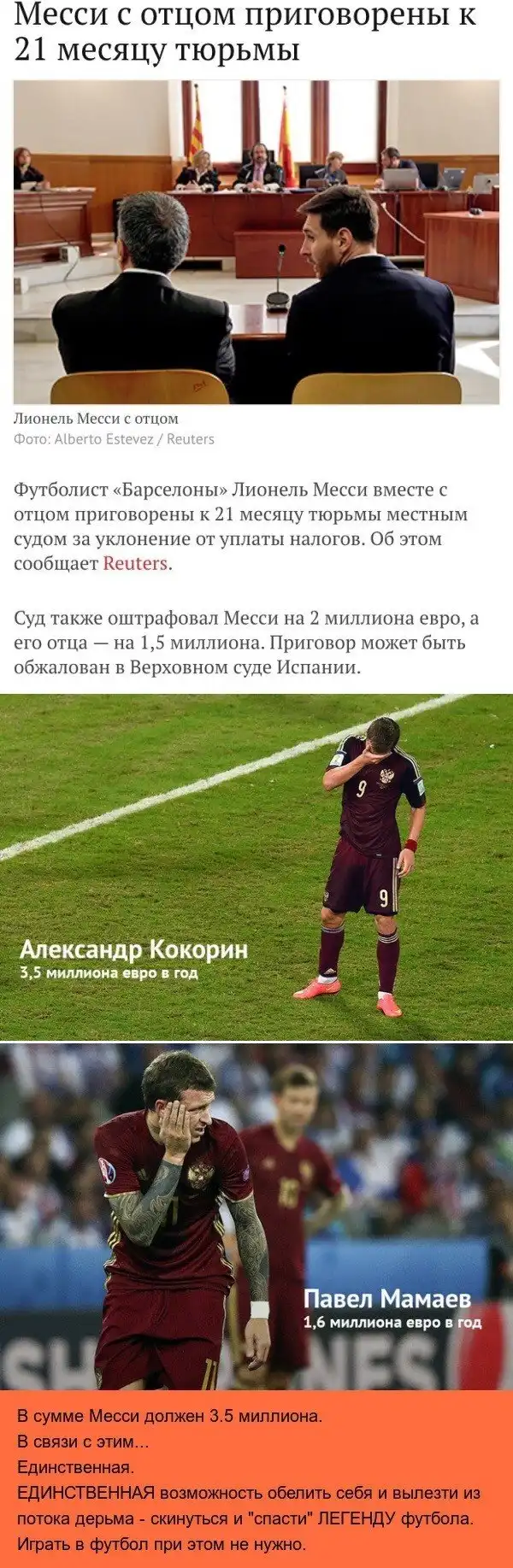 Аргентинский футболист Лионель Месси и его отец Хорхе Орасио Месси приговорены судом в Барселоне к 21 месяцу тюрьмы за налоговые махинации.