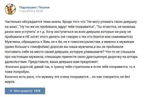 У каждого человека есть своя любимая группа или любимое сообщество в какой-либо социальной сети. Иногда это группа не совсем приличная, поэтому нет возможности в открытом режиме подписаться на неё и прочитывать свежие посты. Мы предлагаем вам очередную порцию из серии интересных постов в группе «Подслушано пошлое». Сегодняшняя запись: Подслушано пошлое предлагает посмотреть несколько интересных и запоминающихся постов, вместе с комментариями из данной группы в социальной сети ВКонтакте.
