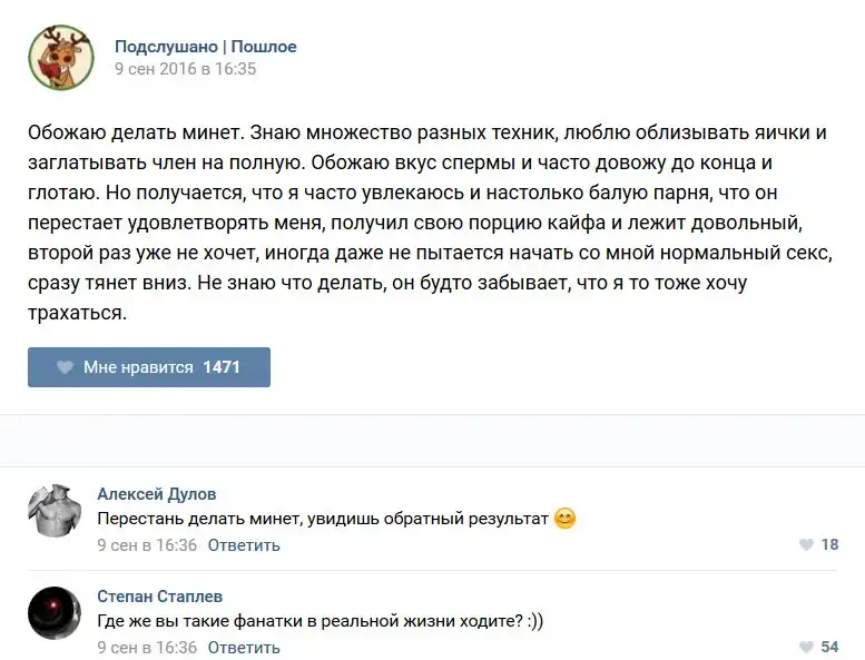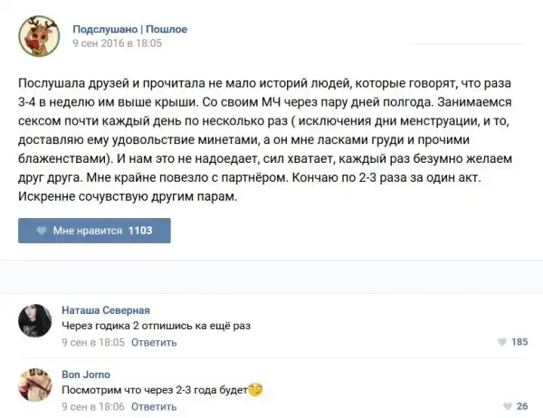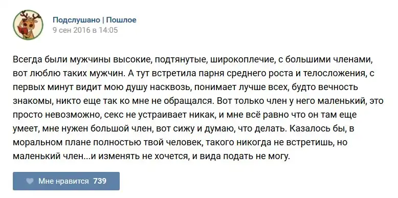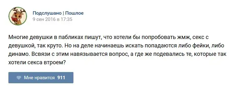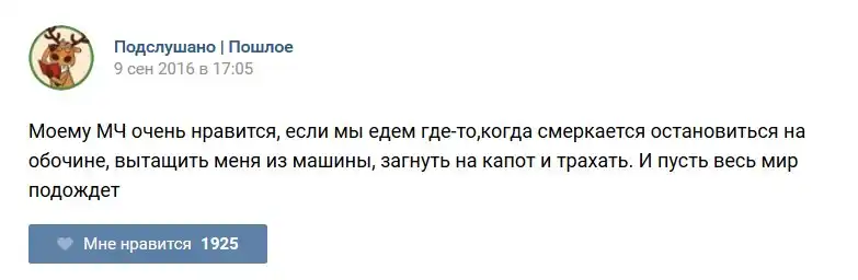 У каждого человека есть своя любимая группа или любимое сообщество в какой-либо социальной сети. Иногда это группа не совсем приличная, поэтому нет возможности в открытом режиме подписаться на неё и прочитывать свежие посты. Мы предлагаем вам очередную порцию из серии интересных постов в группе «Подслушано пошлое». Сегодняшняя запись: Подслушано пошлое предлагает посмотреть несколько интересных и запоминающихся постов, вместе с комментариями из данной группы в социальной сети ВКонтакте.