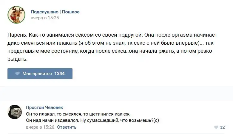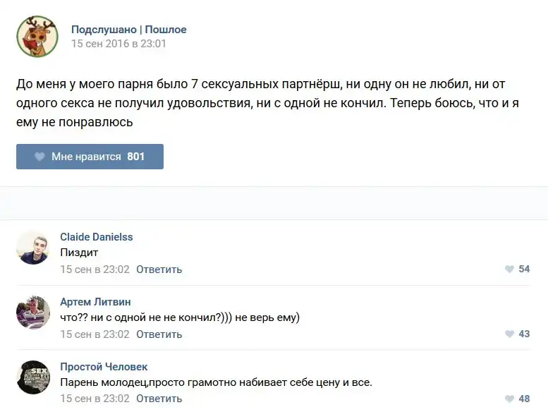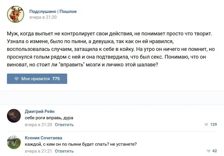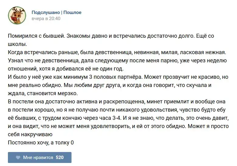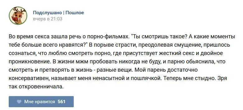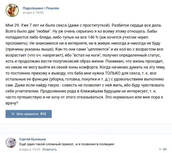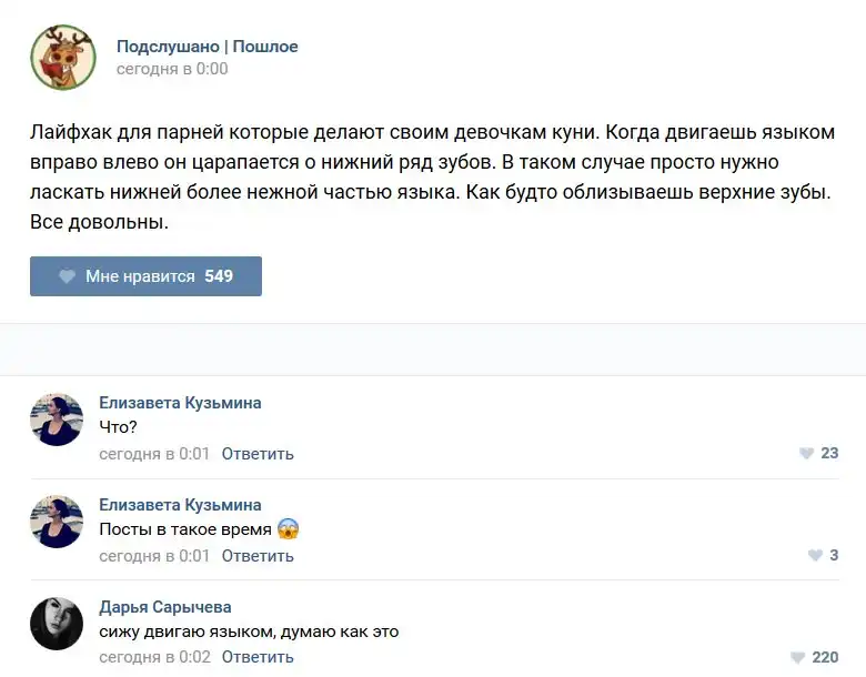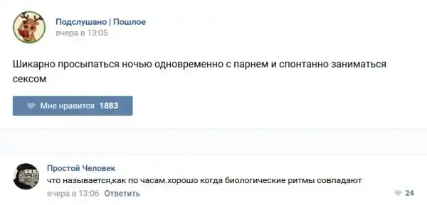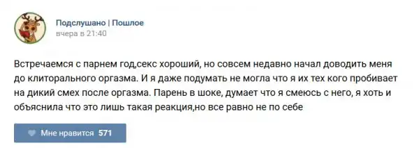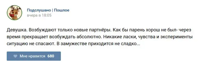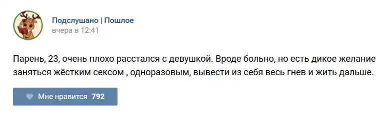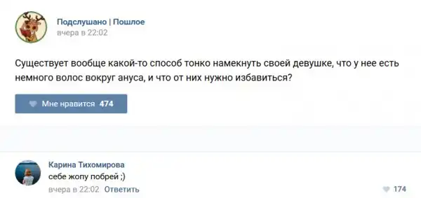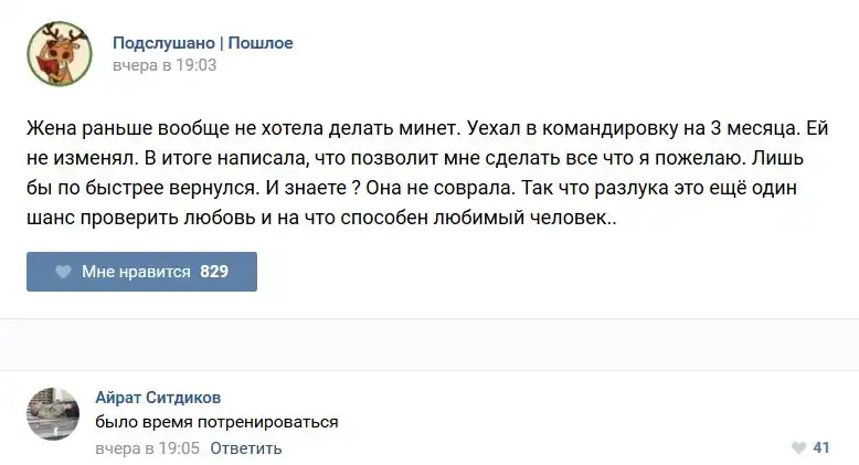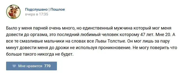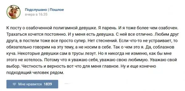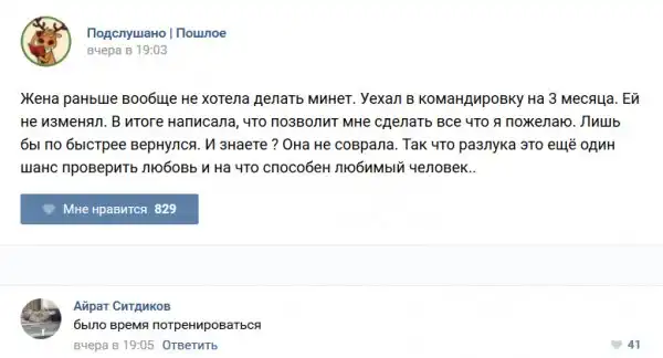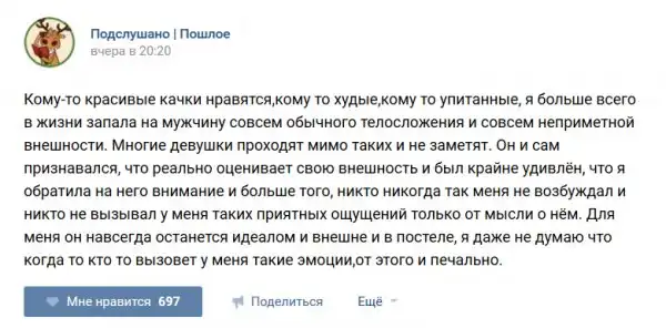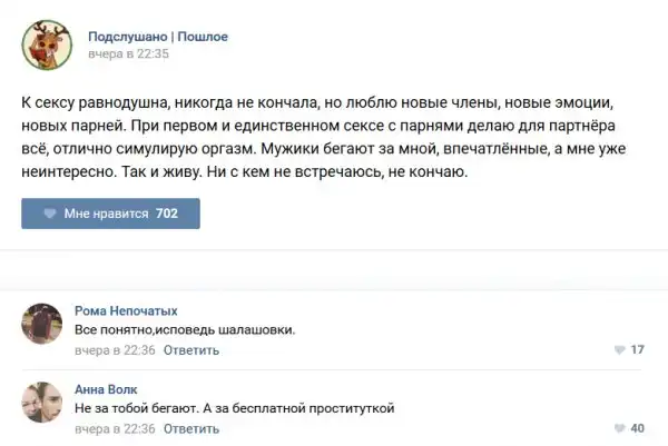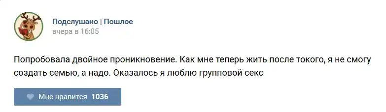У каждого человека есть своя любимая группа или любимое сообщество в какой-либо социальной сети. Иногда это группа не совсем приличная, поэтому нет возможности в открытом режиме подписаться на неё и прочитывать свежие посты. Мы предлагаем вам очередную порцию из серии интересных постов в группе «Подслушано пошлое». Сегодняшняя запись: Подслушано пошлое предлагает посмотреть несколько интересных и запоминающихся постов, вместе с комментариями из данной группы в социальной сети ВКонтакте.