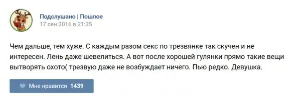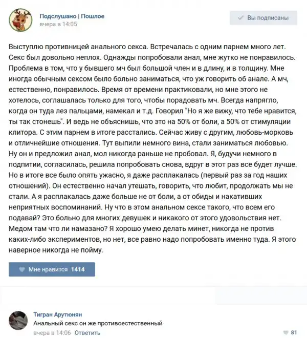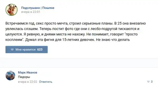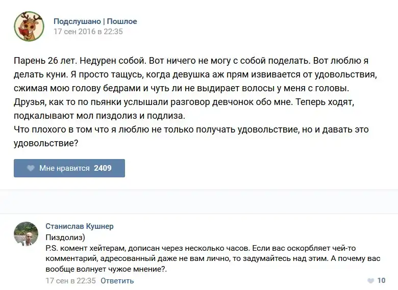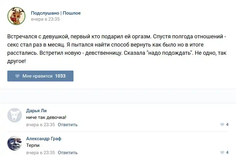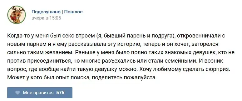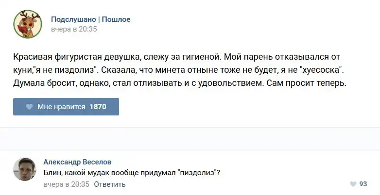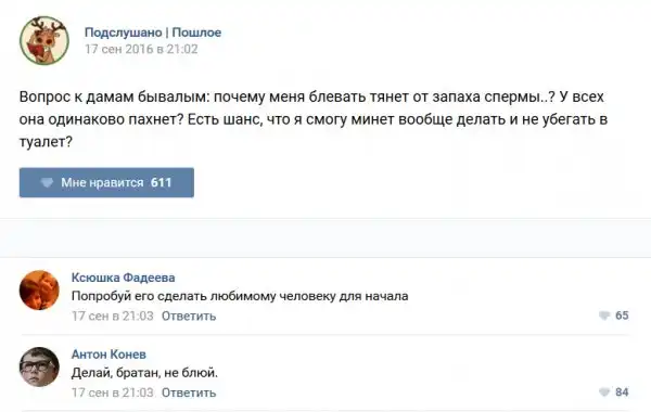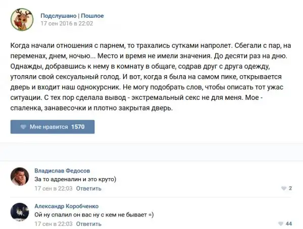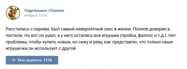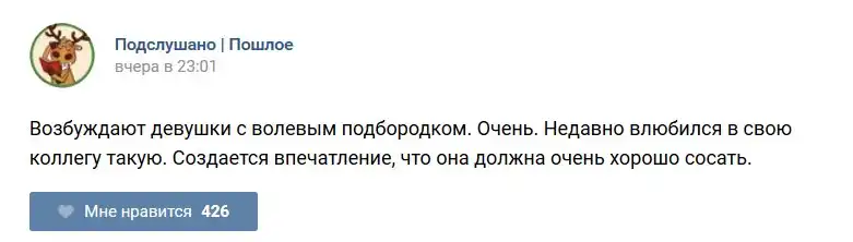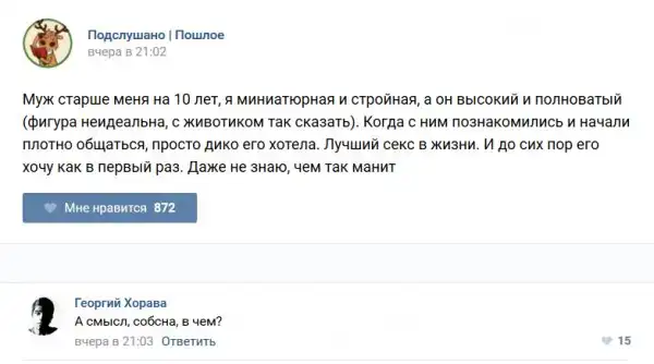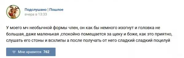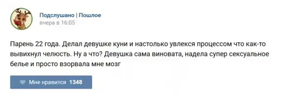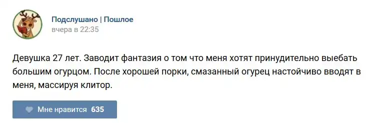 У каждого человека есть своя любимая группа или любимое сообщество в какой-либо социальной сети. Иногда это группа не совсем приличная, поэтому нет возможности в открытом режиме подписаться на неё и прочитывать свежие посты. Мы предлагаем вам очередную порцию из серии интересных постов в группе «Подслушано пошлое». Сегодняшняя запись: Подслушано пошлое предлагает посмотреть несколько интересных и запоминающихся постов, вместе с комментариями из данной группы в социальной сети ВКонтакте.