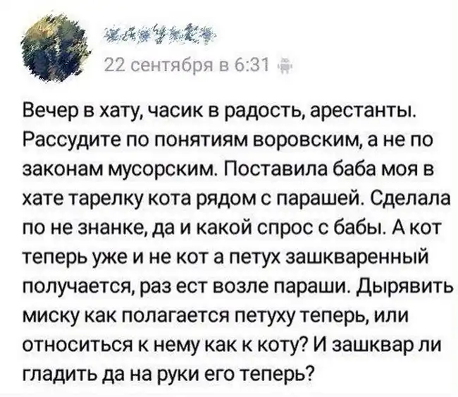 Там по понятиям бабу шкварить надо за дело подлое, а кот не при делах, он зашкваренным не должен считаться