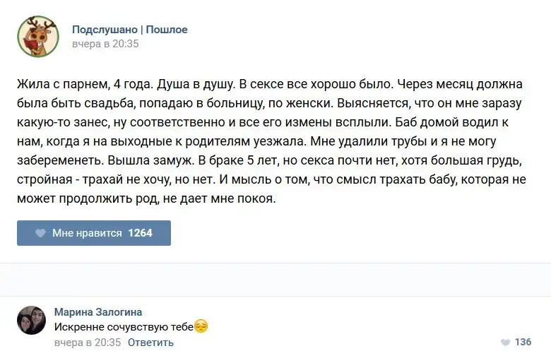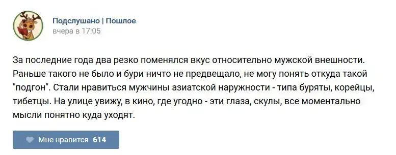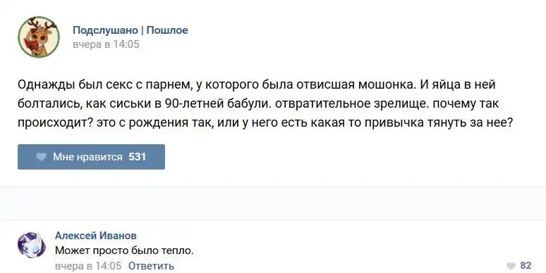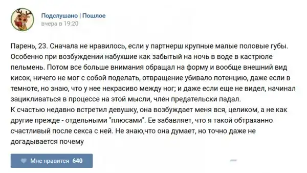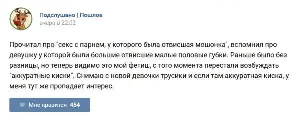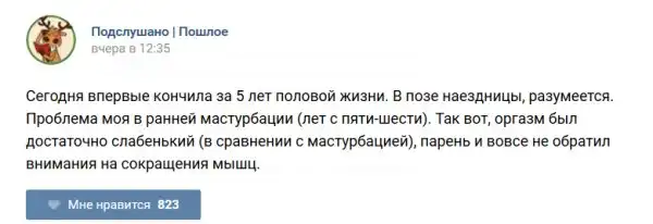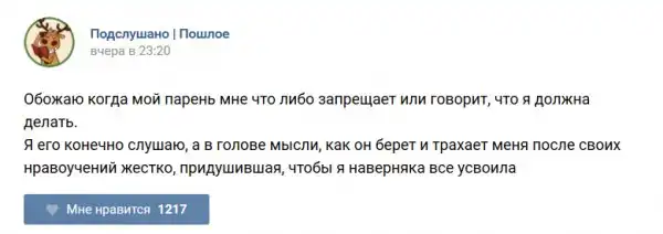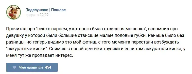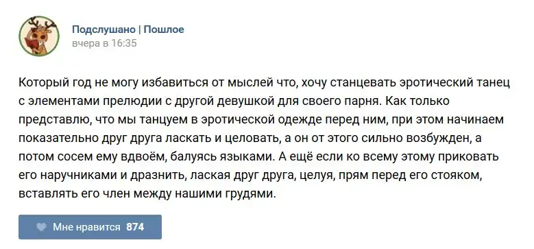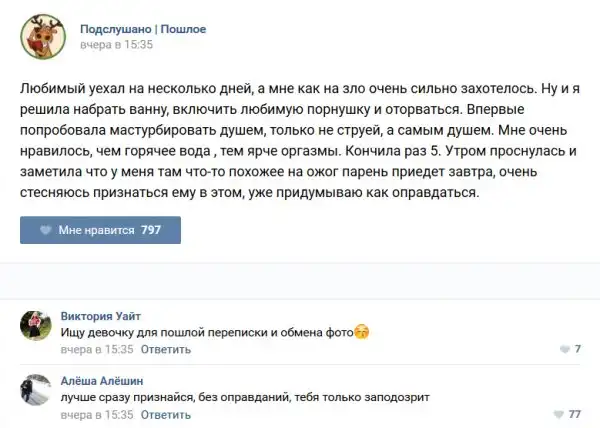 У каждого человека есть своя любимая группа или любимое сообщество в какой-либо социальной сети. Иногда это группа не совсем приличная, поэтому нет возможности в открытом режиме подписаться на неё и прочитывать свежие посты. Мы предлагаем вам очередную порцию из серии интересных постов в группе «Подслушано пошлое». Сегодняшняя запись: Подслушано пошлое предлагает посмотреть несколько интересных и запоминающихся постов, вместе с комментариями из данной группы в социальной сети ВКонтакте.