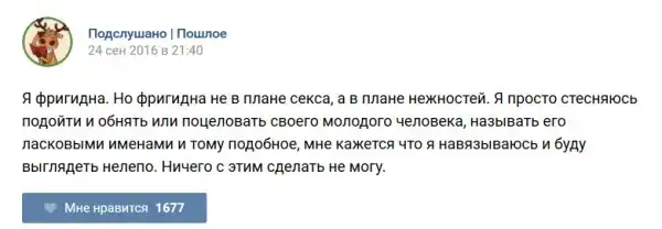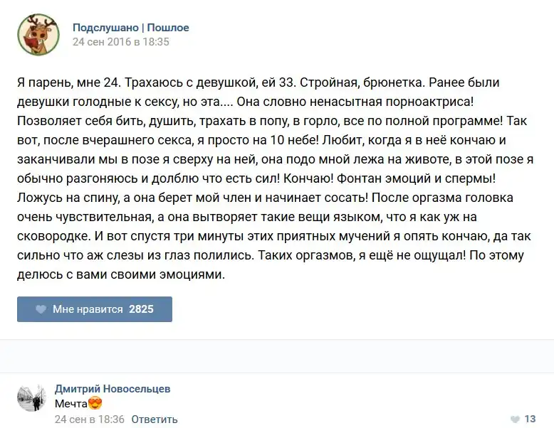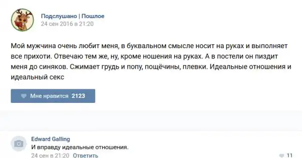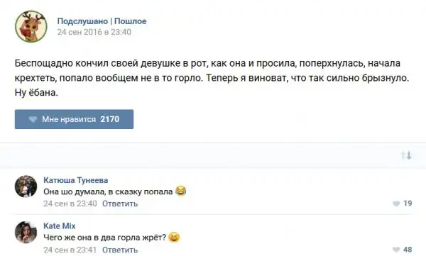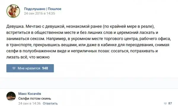 У каждого человека есть своя любимая группа или любимое сообщество в какой-либо социальной сети. Иногда это группа не совсем приличная, поэтому нет возможности в открытом режиме подписаться на неё и прочитывать свежие посты. Мы предлагаем вам очередную порцию из серии интересных постов в группе «Подслушано пошлое». Сегодняшняя запись: Подслушано пошлое предлагает посмотреть несколько интересных и запоминающихся постов, вместе с комментариями из данной группы в социальной сети ВКонтакте.