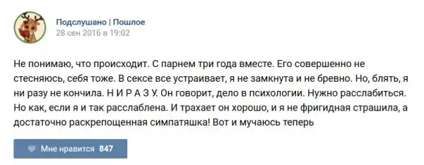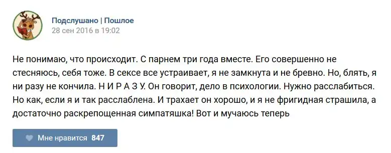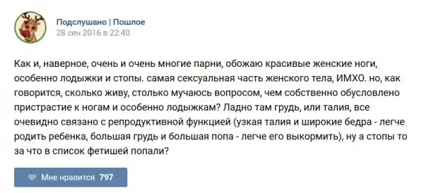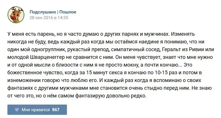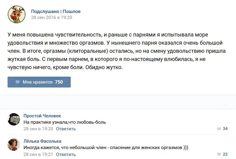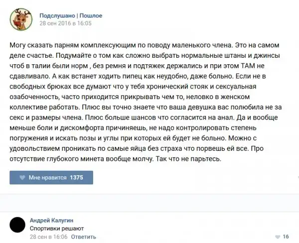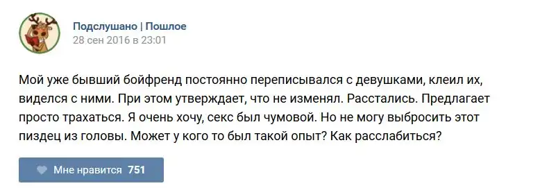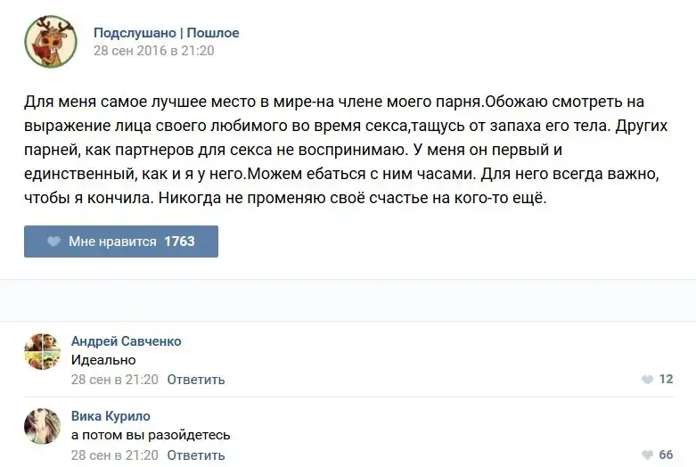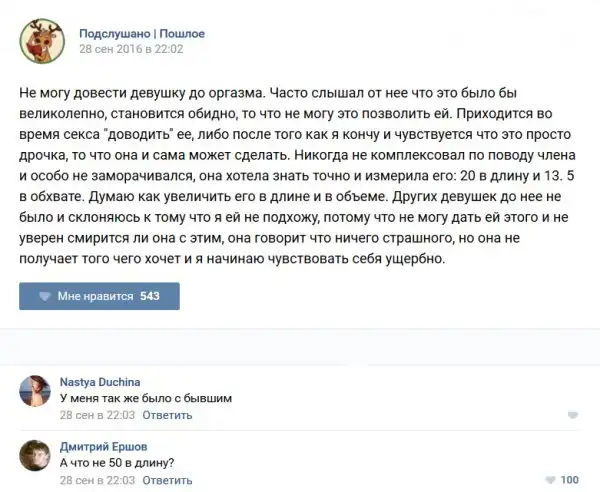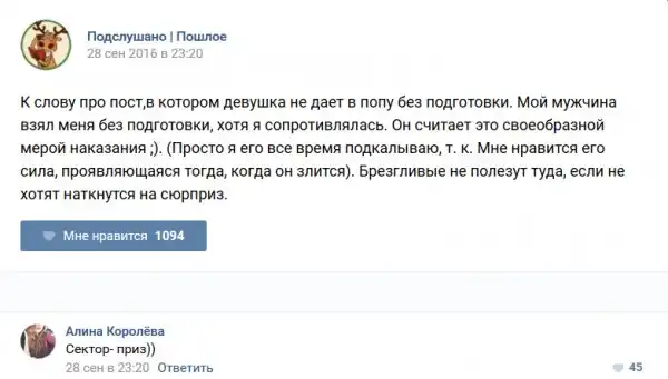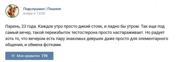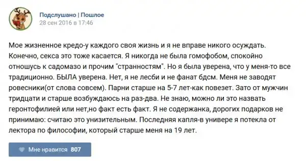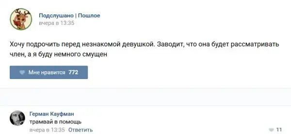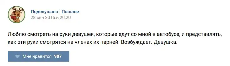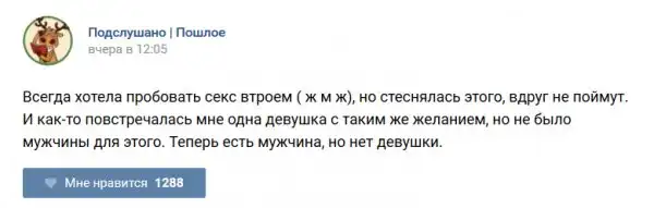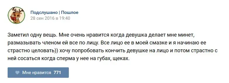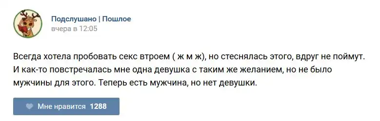 У каждого человека есть своя любимая группа или любимое сообщество в какой-либо социальной сети. Иногда это группа не совсем приличная, поэтому нет возможности в открытом режиме подписаться на неё и прочитывать свежие посты. Мы предлагаем вам очередную порцию из серии интересных постов в группе «Подслушано пошлое». Сегодняшняя запись: Подслушано пошлое предлагает посмотреть несколько интересных и запоминающихся постов, вместе с комментариями из данной группы в социальной сети ВКонтакте.