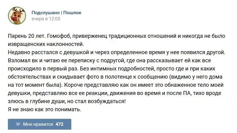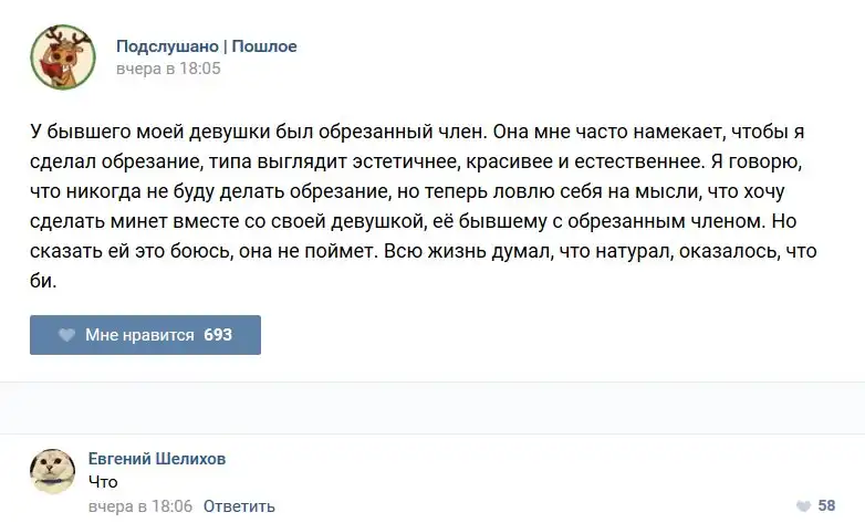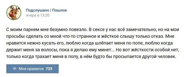 У каждого человека есть своя любимая группа или любимое сообщество в какой-либо социальной сети. Иногда это группа не совсем приличная, поэтому нет возможности в открытом режиме подписаться на неё и прочитывать свежие посты. Мы предлагаем вам очередную порцию из серии интересных постов в группе «Подслушано пошлое». Сегодняшняя запись: Подслушано пошлое предлагает посмотреть несколько интересных и запоминающихся постов, вместе с комментариями из данной группы в социальной сети ВКонтакте.