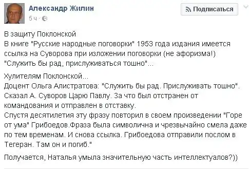 Депутат Госдумы Наталья Поклонская в эфире радиостанции «Вести.fm» приписала цитату одного из героев произведения Александра Грибоедова «Горе от ума» русскому полководцу Александру Суворову. За это пользователи рунета развернули настоящую травлю против ошибившегося депутата.