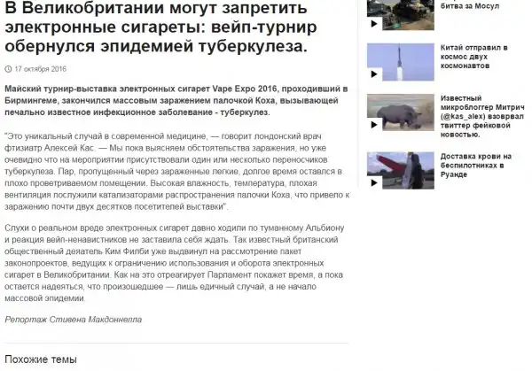 В сентябре помощник российского премьера, бывший глава Роспотребнадзора Геннадий Онищенко высказал идею о необходимости запрета вейпов (электронных сигарет, мини-кальянов). Позднее Онищенко заявил, что нужно принять закон, приравнивающий электронные сигареты и вейпы к обычным сигаретам. В начале ноября Мосгордума приняла резолюцию по ограничению продажи и потребления устройств, имитирующих курение, в частности электронных мини-кальянов (вейпов). Об этом сообщает РИА Новости.