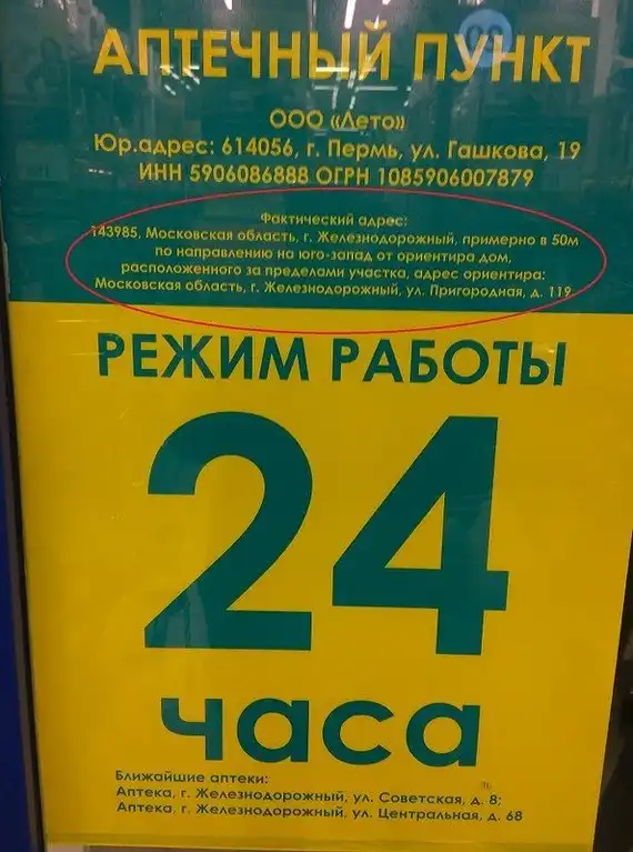 фактический адрес аптеки) у меня так же написано на земельный участок только в 350 метрах от ориентира)) вот и найди его если не знаешь)