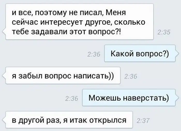 Помните смешную переписку, когда женщина обиделась на односложные ответы. Ну вот тоже самое, но мужчине можно, да?