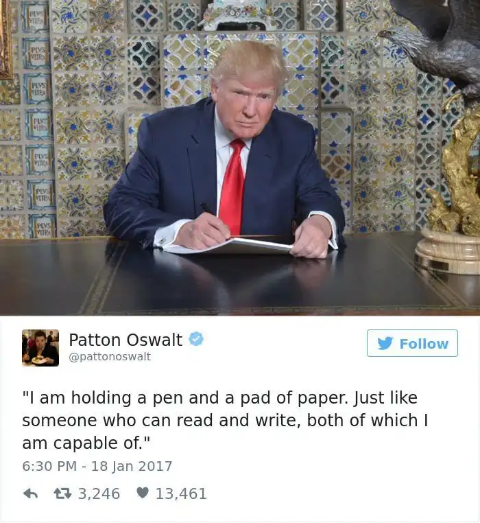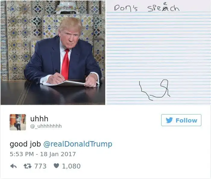 Ставший ныне полноправным президентом США Дональд Трамп опубликовал на своей странице в соцсети фотографию, на которой он пишет текст своей приветственной речи. Интернет-пользователи не упустили возможности позубоскалить над этим историческим моментом в жизни нового американского президента!