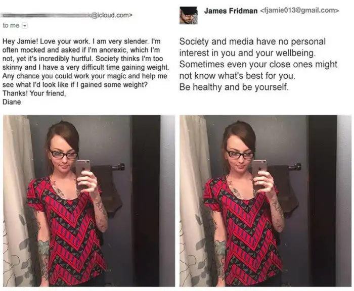 - Привет, Джейми. Люблю твои работы. Я очень худая. Надо мной часто смеются и спрашивают, не анорексичка ли я, конечно же нет, но меня это все очень обижает. Общество считает меня слишком тощей, мне очень сложно поправиться. Ты бы не мог поколдовать и помочь мне увидеть, как бы я выглядела, если бы набрала вес? Спасибо! Твоя подруга Диана.