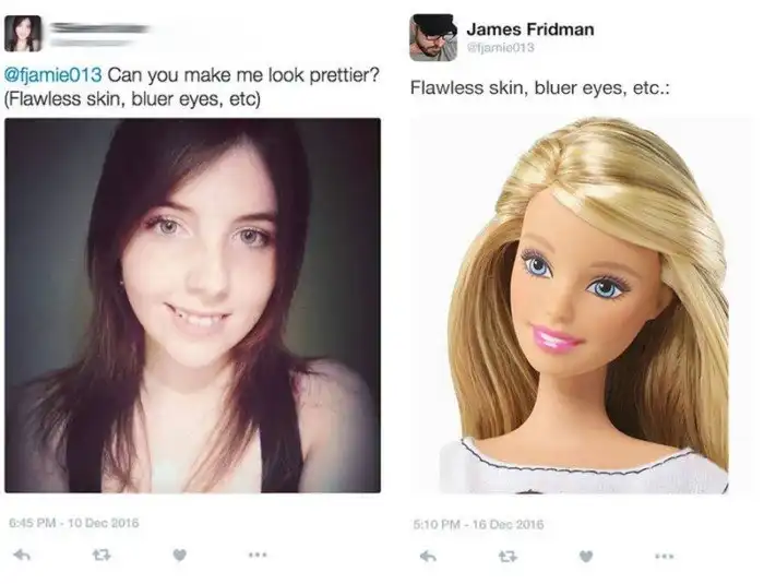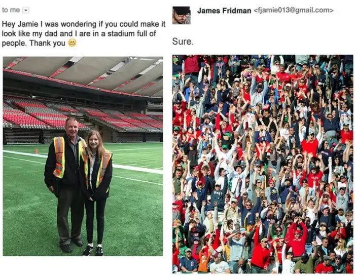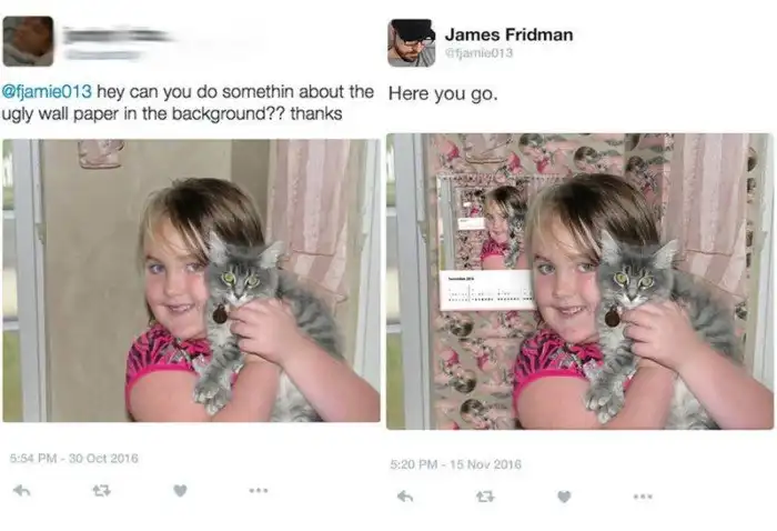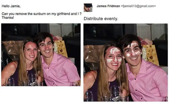 Джеймс Фридман - гуру фотошопа, готовый помочь каждому желающему. Правда, просьбы он воспринимает буквально, так что заказчик получает именно то, что просил. Взгляните на примеры блестящего троллинга!