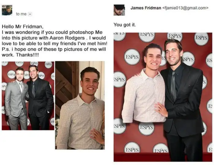 - Здравствуйте, мистер Фридман. Не могли бы вы добавить меня в эту фотографию с Аароном Роджерсом. Мне так хочется сказать свои друзьям, что я встретил его! Надеюсь, какая-нибудь из моих фотографий подойдет. Спасибо!!!