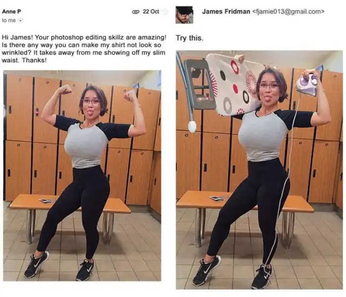 - Привет, Джеймс! Твои фотошоп-навыки просто невероятны! Можешь как-нибудь сделать так, чтобы моя футболка не была такой помятой? Прям отвлекает внимание от моей тонкой талии. Спасибо!