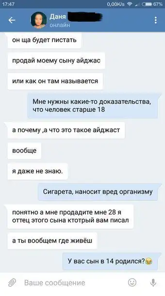 Далее вас ждет довольно забавная переписка школьника, решившего податься в вейперы и пытавшегося купить себе электронную сигарету. Давайте посмотрим, что из этого вышло.