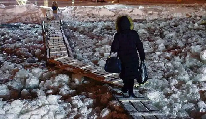 Научные работники американской антарктической станции Амундсен — Скотт идут на работу через ледяные торосы.