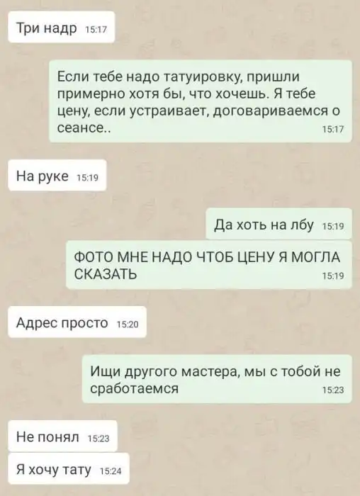 Тату-мастерам, как и другим людям, работающим в сфере услуг, попадаются разные клиенты, среди которых бывают и такие, общаться с которыми очень сложно или попросту невозможно. Пример подобного общения ждет вас в этой переписке.
