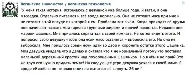 В том что носители идей веганства не совсем адекватные люди мы подозревали давно. Достаточно дать им слово и просто почитать что они сами о себе пишут, а также истории, которые их окружают.