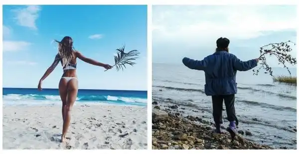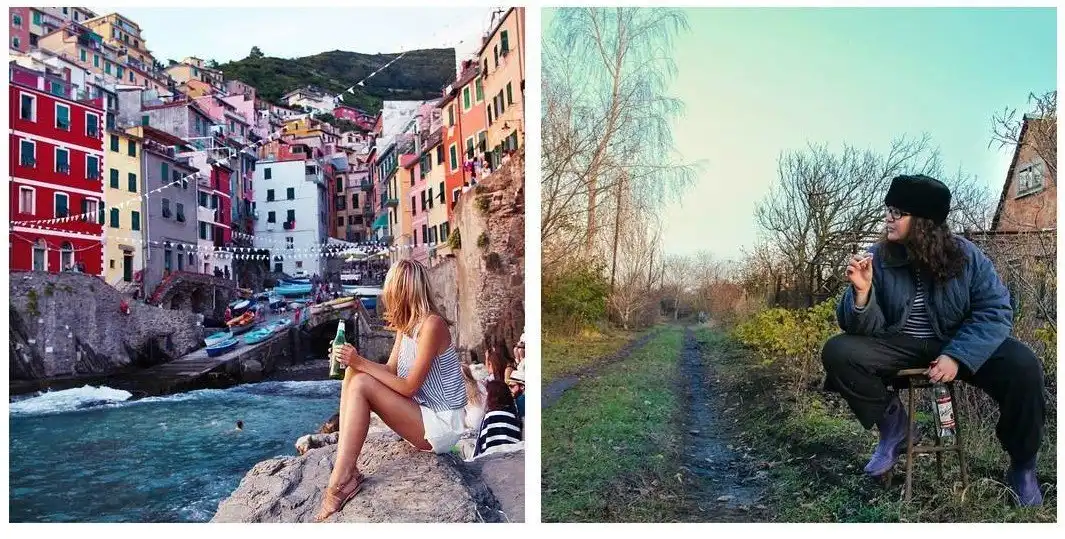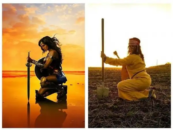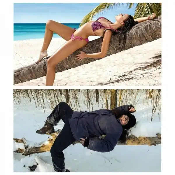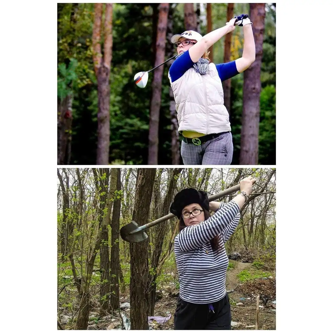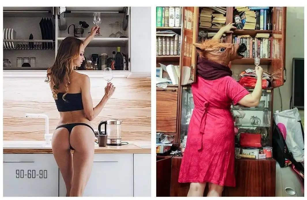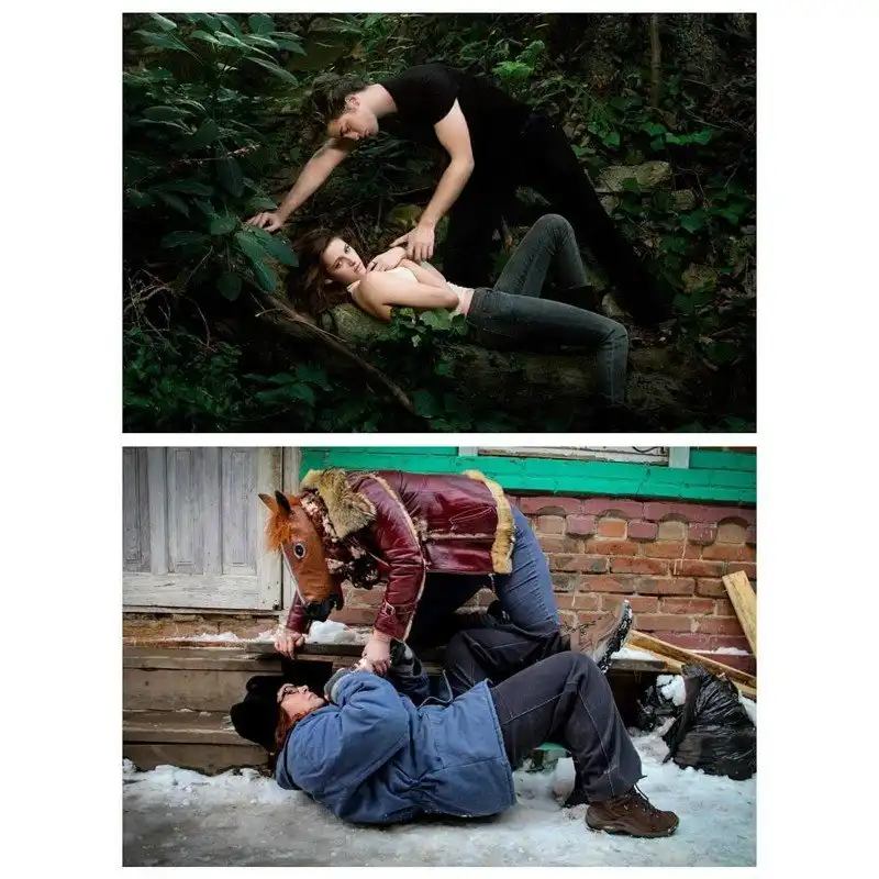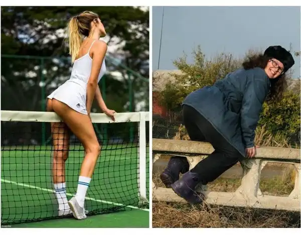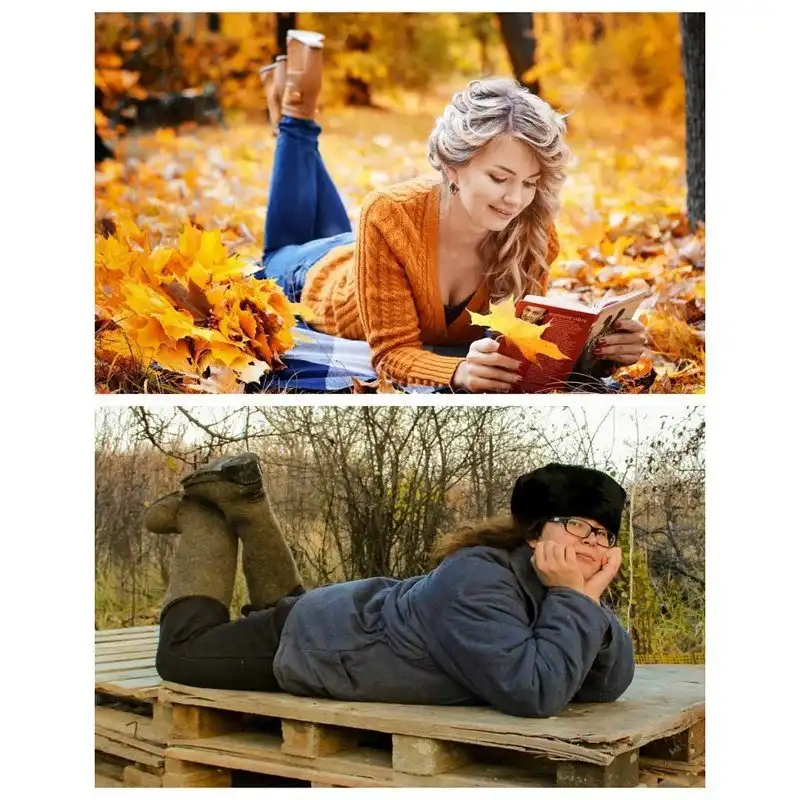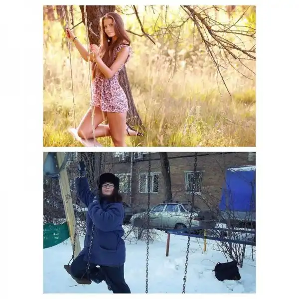 Девушка по имени Катя Трухироу постаралась в "точности" повторить позы и выражения лиц девушек, которые фотографировались.