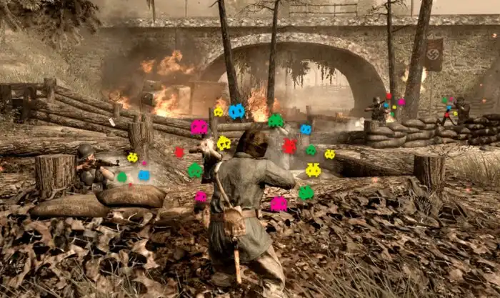 Иногда, когда игра совсем не идёт, возникает сильное желание ворваться на поле боя с неведомым оружием и всех победить. Например, во Вторую мировую войну с бластером! Это как «Назад в будущее», только с мёртвыми, разлетевшимися на куски фашистами! Как ты понял, в этой игре такое возможно. Всё, что нужно, так это в уровне «Слабое Сопротивление» (второй по счёту) пробежаться по трём сильно контрастирующим с остальным фоном лужам и остановиться на 10 секунд в последней. После этой странной процедуры из земли с жутким грохотом вылезут 4 огромные статуэтки, у каждой из которых можно будет получить настоящий бластер. Кстати, пасхалка действенна и в кооперативе, так что будет за счёт чего выделиться.