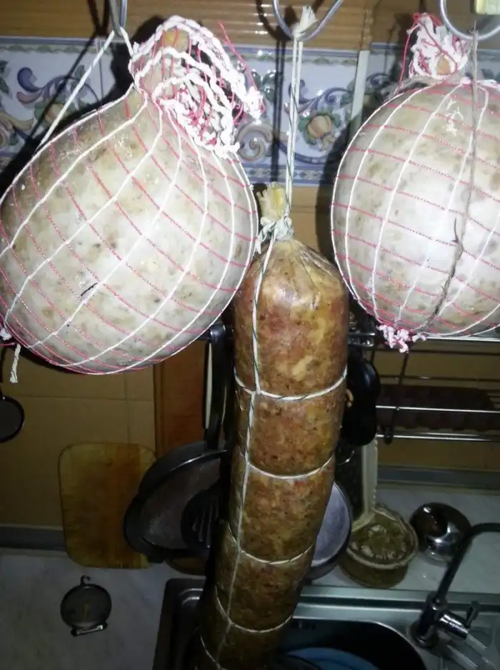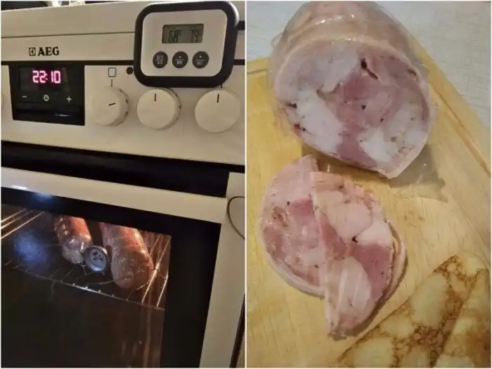 А вот и технология: -Говядина жирность 4% - 400 гр. -Свинина жирность 27% - 900 гр. -Свинина жирность 6% - 850 гр. -Соль нитритная (0.58%) - 39 гр. -Смесь специй Емколбаски - 15 гр. Мясное сырье порезал на куски и слегка подморозил. Свинину перемолол на решетке 6 мм. Добавил соль и специи, вымесил фарш миксером, набил в говяжью череву калибр 38-40 мм (получилось 1 кг фарша на 1 м оболочки). Сутки в холодильнике. Варка в духовке при температуре 72-76 гр до температуры внутри батонов 69 гр. Сразу после варки копчение 15 минут при температуре 45 градусов. Остывание при комнатной температуре около 2 часов. На ночь в холодильник. Выход 84%.