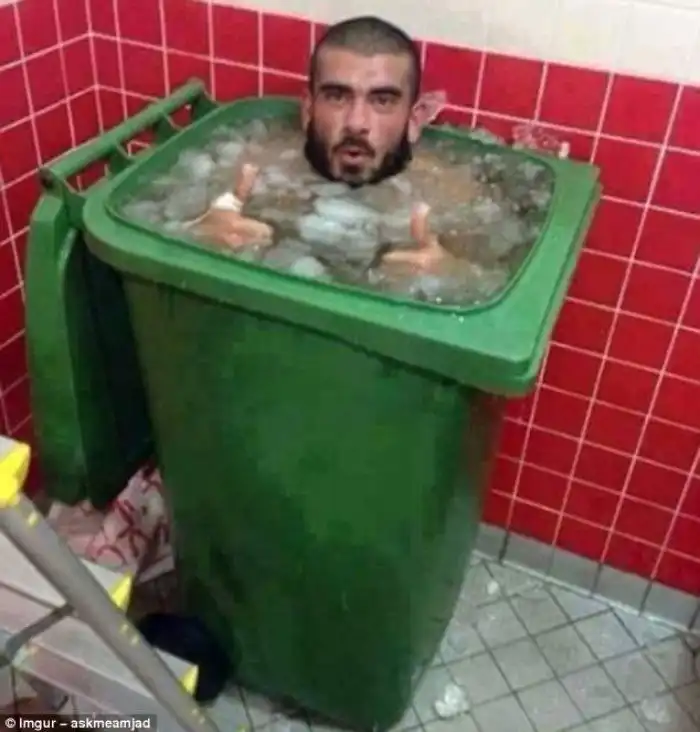Этот додумался превратить свой мусорный бак на колесах в своеобразный ледяной бассейн.
