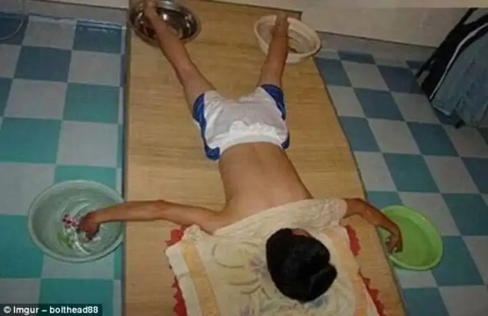 А этот, кажется, уже сдался в битве с жарой... Мы видим его лежащим в позе побежденного, погрузив руки-ноги в чашки с холодной водой.