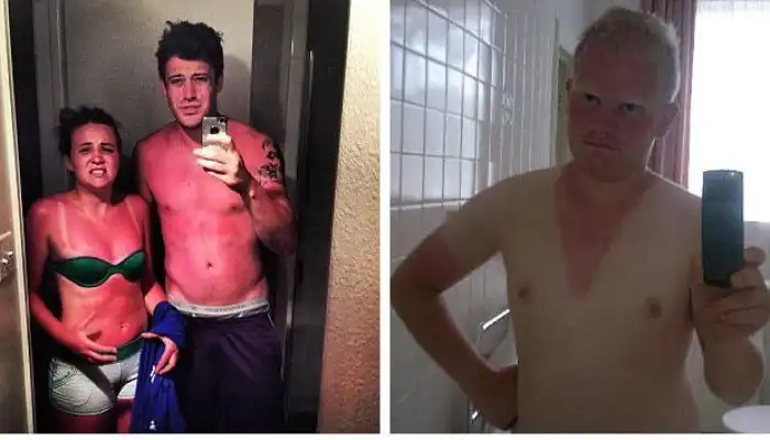 Летние напасти: эта парочка вздрагивает от боли при одном взгляде на собственное изображение в зеркале, настолько они успели подпалить свою шкуру... А вот парню справа, похоже, не слишком нравится узор, который остался на его теле после солнечных ванн в футболке.