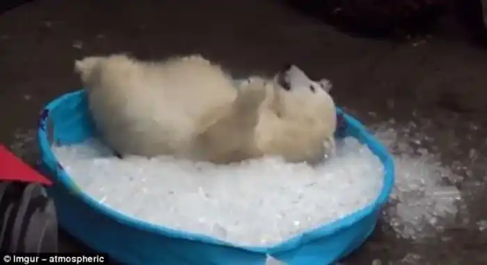 Сколько радости! Белому мишке дали возможность улечься в полный льда детский бассейн...