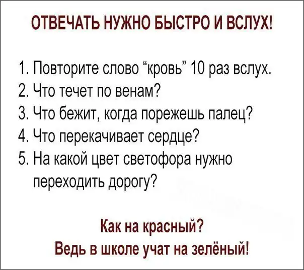На какой свет нужно переходить дорогу? Кровь!!!! Так ответил я.