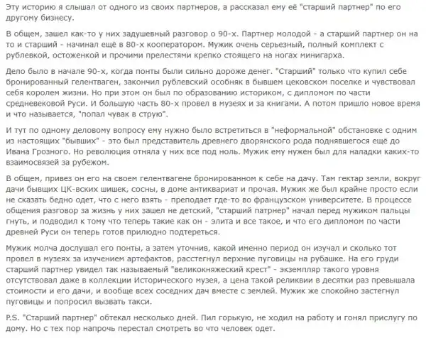 Последнее жизненно. Даже если и неправда. У нас эти ПДД (понты дороже денег) до сих пор гуляют. При чем даже у тех, у кого этих денег нет и не было. А возьмём некоторых мериканских миллионеров. Машина простая, если вообще не велосипед, одежда простая, высокомерие отсутствует, улыбчивы, приветливы, добродушны. Не деньги человека красят.