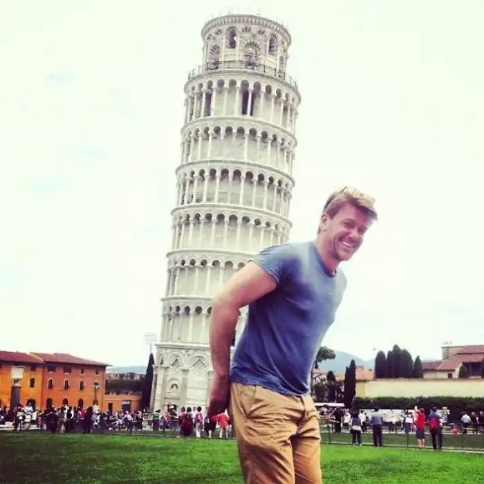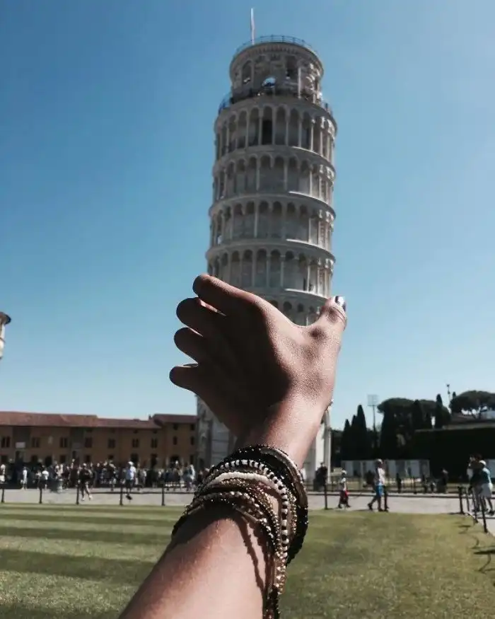 Побывать у знаменитой падающей Пизанской башни и не сделать фото на память - такого, конечно, допустить нельзя! Тем более, местоположение башни открывает массу возможностей для эксперимента. Самые скучные типы делают снимки, на которых они якобы пытаются поддержать падающее строение. Ну, а люди творческие придумывают сюжеты поинтереснее! В меру своей испорченности, разумеется.