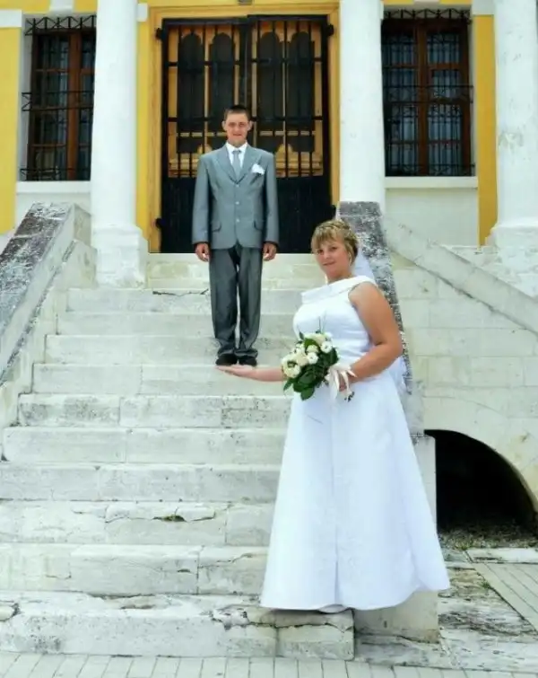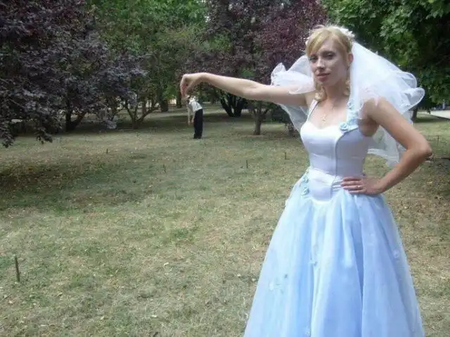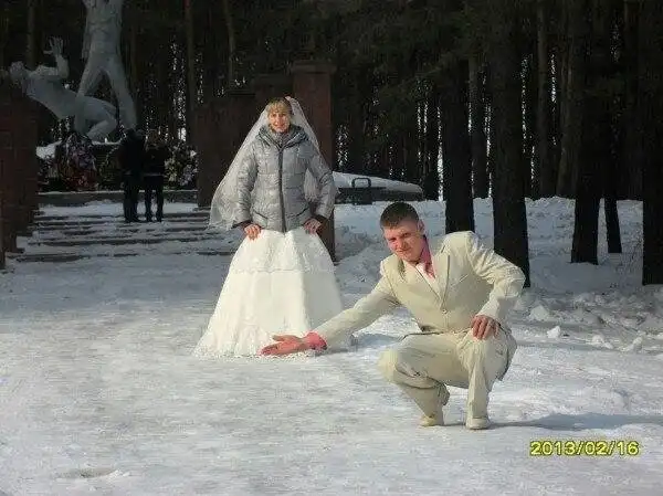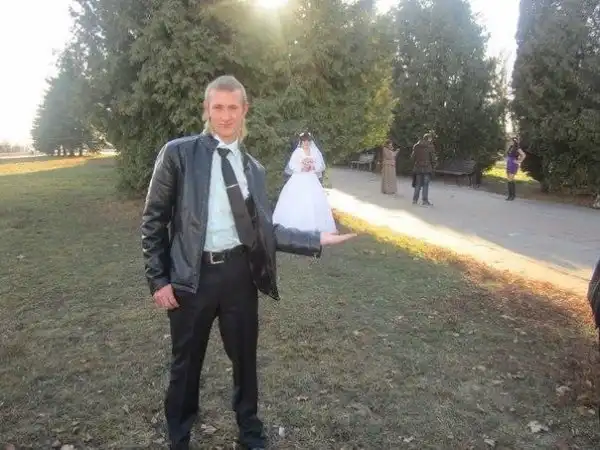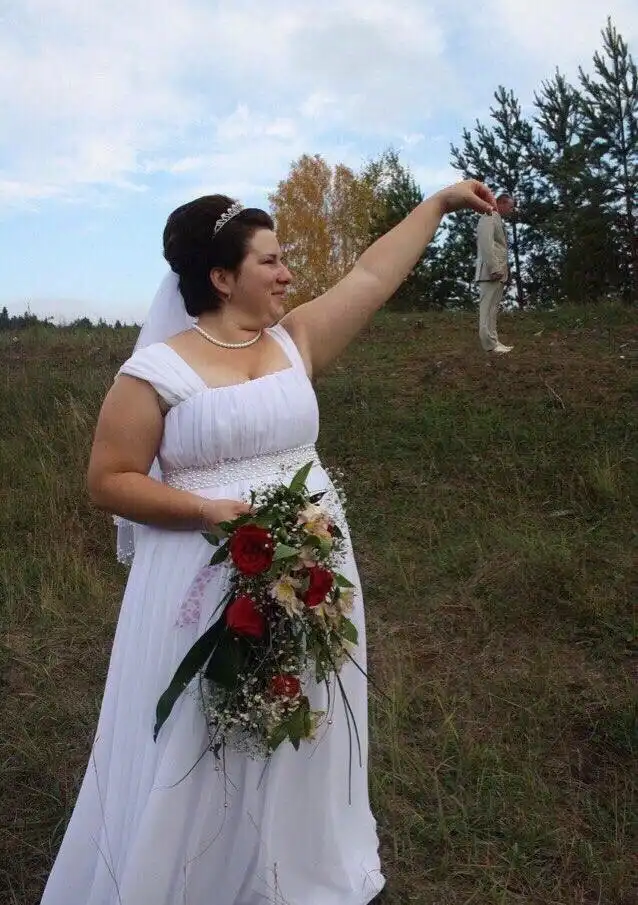 2. Невеста держит пальцами за шиворот мини-жениха.