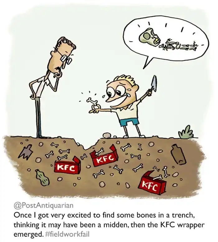 Археолог обрадовался тому, что обнаружил в траншее кости. Уже подумал, что нашел что-то ценное, но тут наткнулся на пустые коробки из KFC