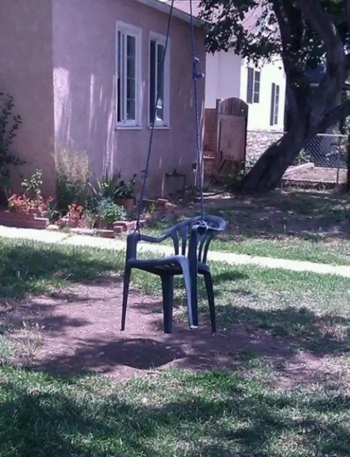 Если у вас есть дети - качели им просто необходимы. Причем качели можно сделать из подручных средств - а зачем лишние деньги-то тратить. Вон, берите на заметку: пластиковый стул, веревка - и сидишь качаешься.