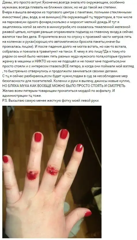 За сочинение про падение двойка! Ободраны костяшки, сфига ли, если она отпустила пакеты и успела подставить руки, значит ладони должны быть ободраны. Фото сделано в домашнем интерьере. А она пишет, что была в травмпункте, что ж ее отпустили с драной рукой что ли... блин, неужели им так внимания не хватает, что вот такие истории пишут.....