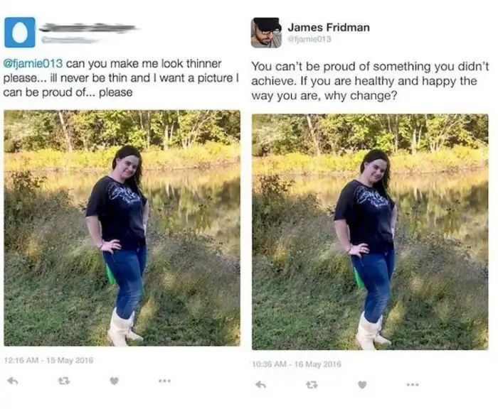 16. Привет, Джеймс. Можешь сделать меня красивее на этом фото? Я не уверена в себе, еще страдаю от пищевого расстройства, и мне нужна фотография, которая будет вдохновлять, лучшая версия меня.