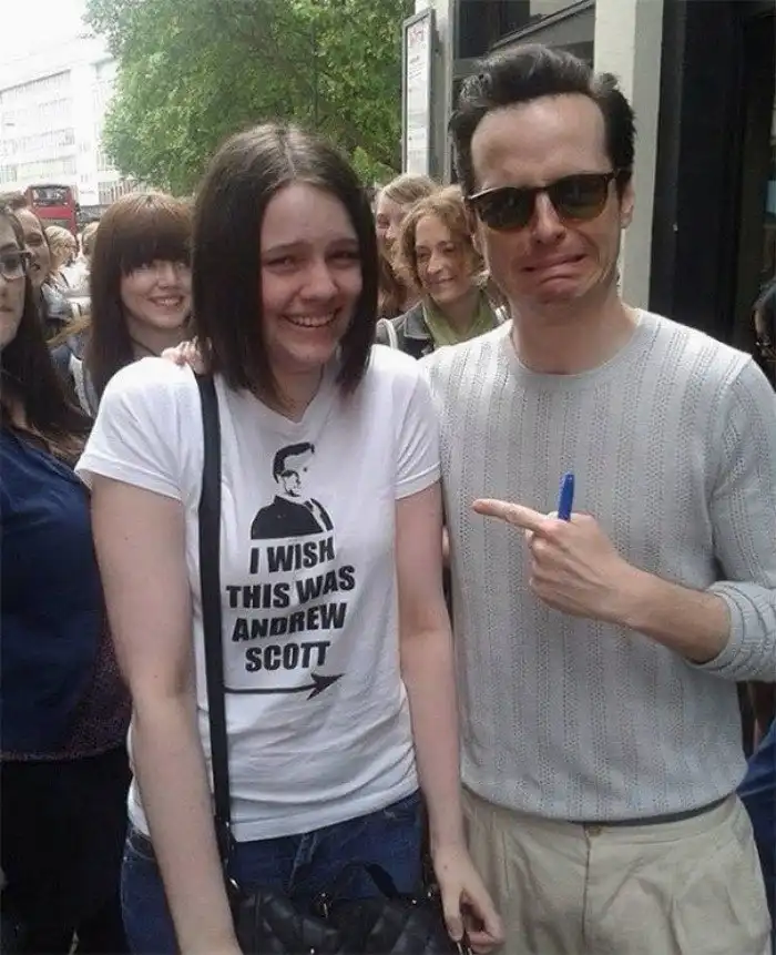 Актер Эндрю Скотт не упустил случая попозировать с поклонницей, одетой в футболку с надписью: "Хотелось бы, чтобы это был Эндрю Скотт!"