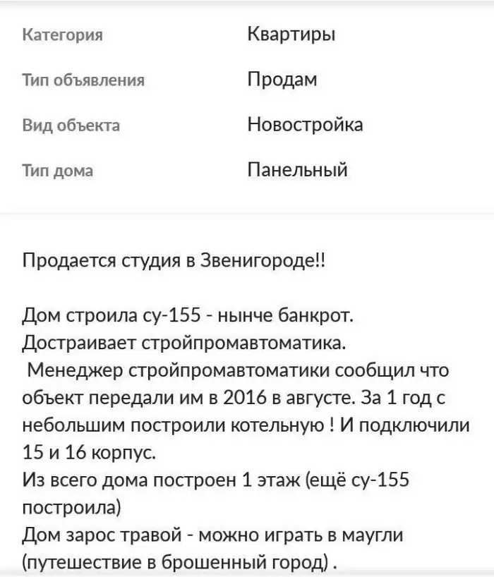 Сейчас очень популярны и вот такие объявления. Обманутые дольщики продают не только свои недострои. Они продают образ жизни и армию единомышленников